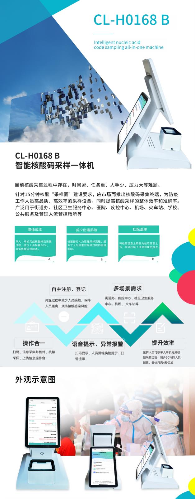 卡联智能核酸信息采集终端可通过扫描健康码、二维码等数字标签,实行全自动信息读取、采集与核对和上传,包括被检测人员的身份、行程、前次核酸检测,以及检测试管、转运箱、时间、地点、机构等核心信息,同时同步完成信息上传指挥中心、疾控中心等;